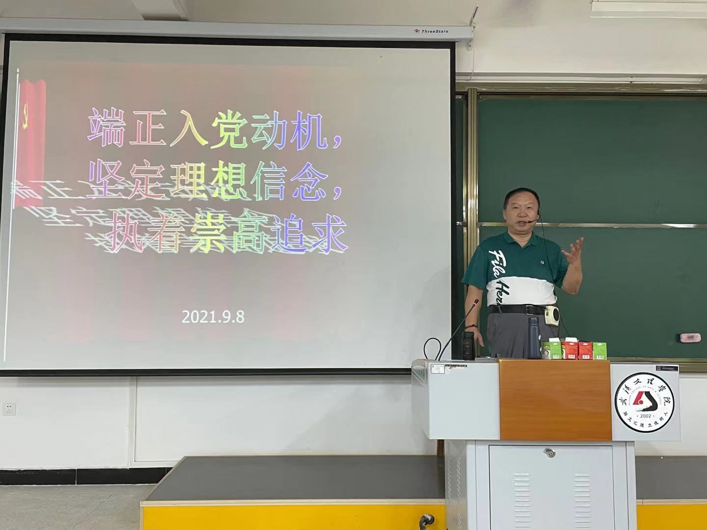 9月8日球友会教师党支部书记徐江老师,在院内开展了一次“端正入党动机、坚定理想信念、执着崇高追求”为主题的党课宣讲活动。徐老师详细罗列不良入党动机类型,让同学们对照自身发现问题;讲述优秀党员事迹,树立学习榜样;介绍党的优良传统,指明学习方向。所有在校员工党员、部分重点发展对象和部分积极分子等100名余同学参加了活动。