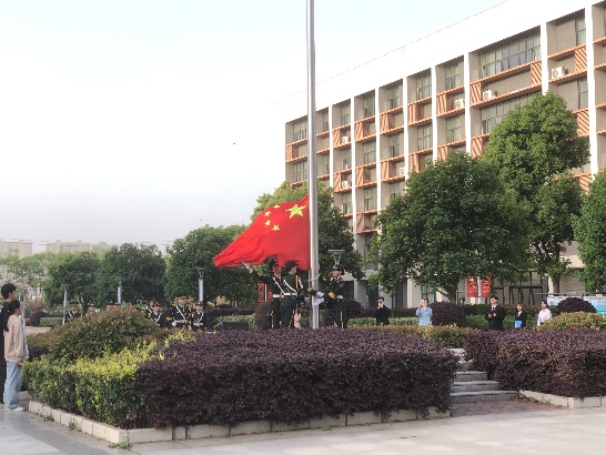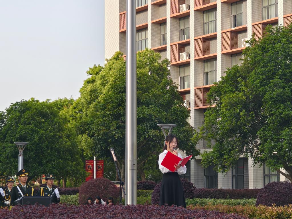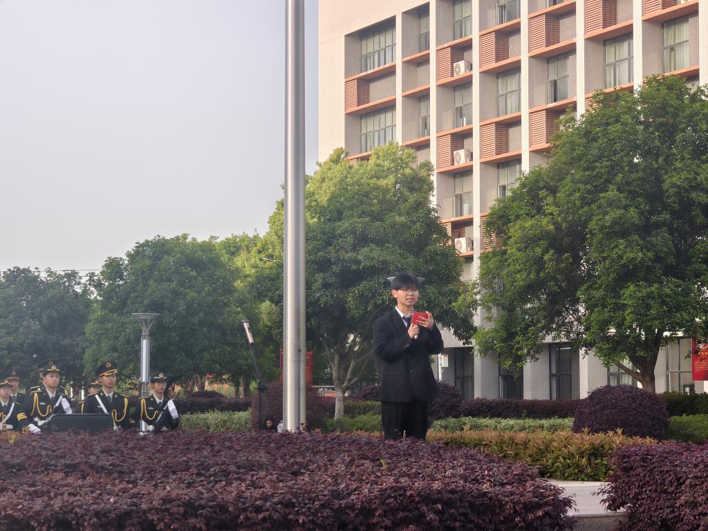 升旗仪式开始,国旗仪仗队步伐铿锵,护卫五星红旗迈向旗台。国歌响起,擎旗手奋力扬臂,红旗舒展升空。全体师生肃立,行注目礼,目光追随着飘扬的旗帜,爱国之情在晨光中升腾。