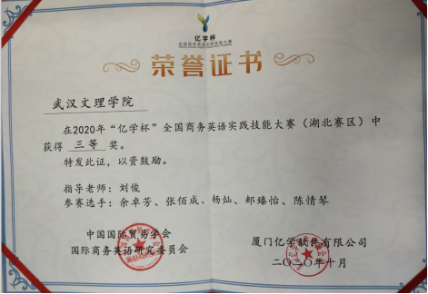 2020年11月21日,商务英语系刘俊老师收到亿学杯商务英语实践技能大赛组委会寄来的证书,17级商务英语专业郏臻怡、杨灿、陈情琴、余卓芳、张佰成五位同学在刘俊老师和张弘老师的指导下,在第三届亿学杯商务英语实践技能大赛中喜获三等奖。