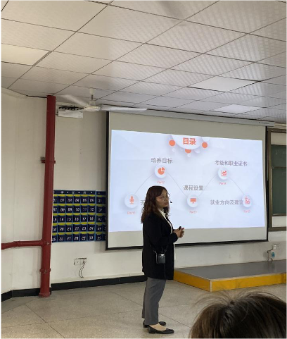 谢灵敏老师就商务英语方向的职业发展规划、课程设置、就业方向、考研情况、技能比赛、考试证书等方面进行了详细讲解。同时,谢老师以个人就业经验为同学们提供了专业选择的参考价值。