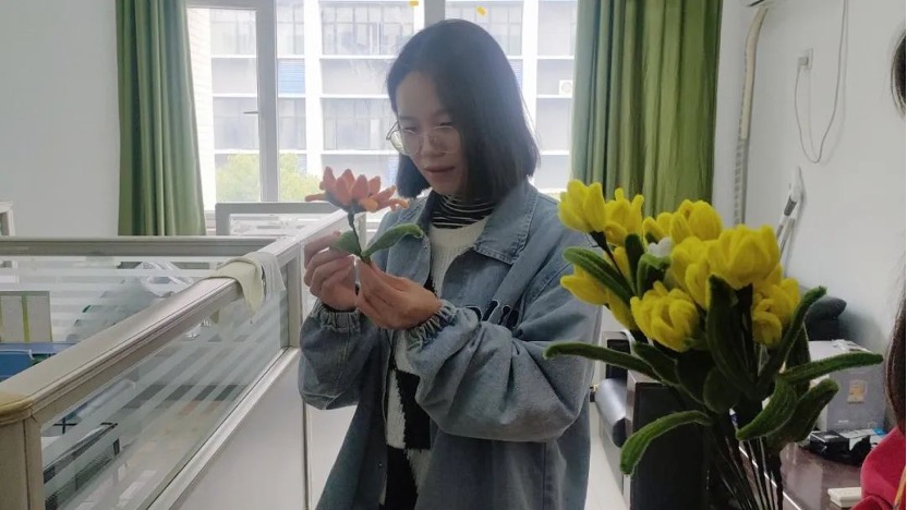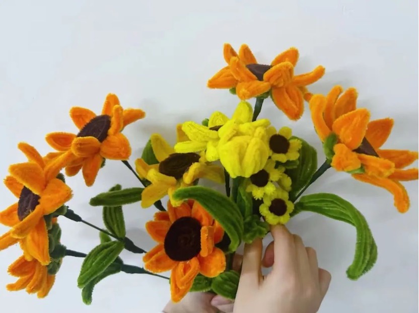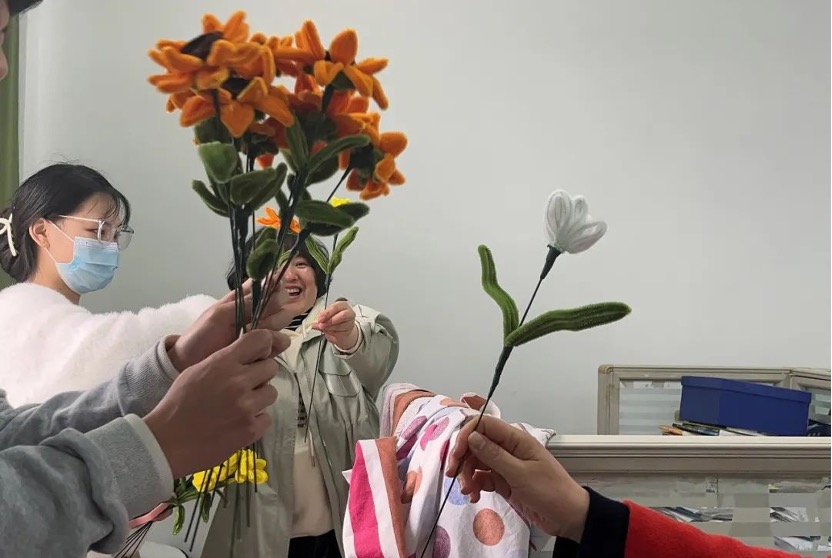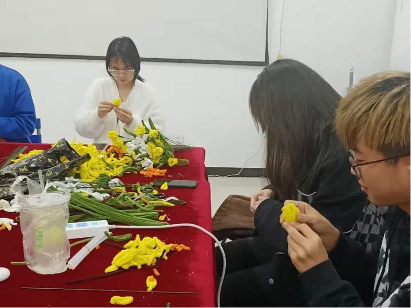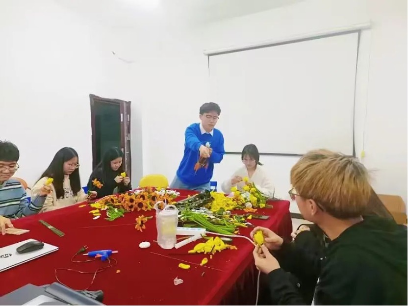 节日前几天,心协成员们利用晚上时间,在公司会议室制作手工,将一根根扭扭棒变成花的形态。从一片一片花瓣的组装、树叶的挑选和整体的调整,都为了使花造型更加立体。经过同学们的分工协作,将大家的心意和祝福融入了一朵朵用心的作品中。