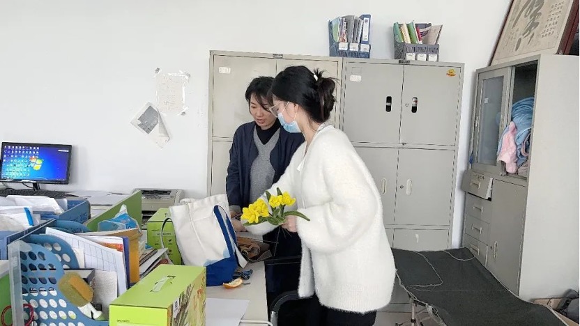 活动开始时,心协的成员在杨洁书记引导下,由会长们将成员们亲手制作的向日葵和郁金香送给各位老师,贴上最独特的“姓名藏头诗”,并对各位老师说一句“您辛苦啦”。师生们脸上都洋溢着喜悦的笑容,办公室的走廊上充满了欢声笑语,同学们和老师们都感受到了这份节日的温暖。