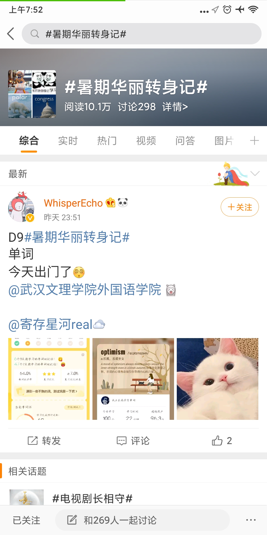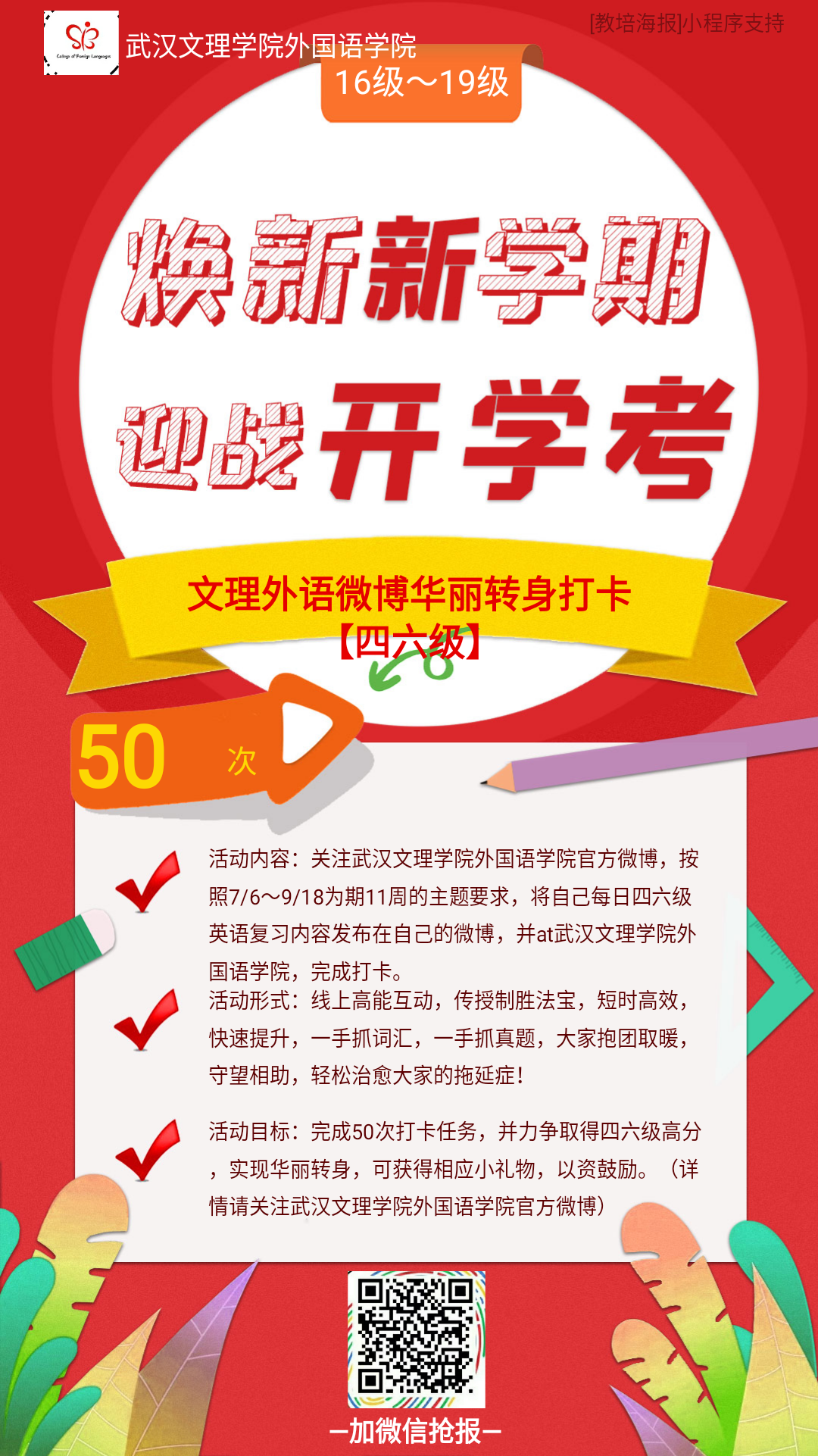 活动刚推出时,微博“文小外”还有些担心活动的热度和同学们的积极性。但是,在活动推出一周以来,新浪微博“暑期华丽转身记” 话题便突破10万人次阅读量,彻底打消了小编的顾虑,后期小编会更积极地推出每周复习主题。穿越CET的墙,搭建CET的桥,让我们一起抱团取暖、守望相助、共克时艰、勇创佳绩!