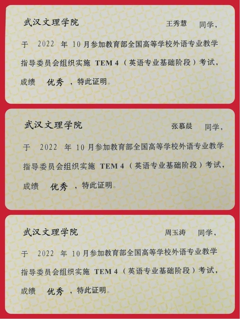 开学伊始,球友会翻译教研室传来好消息。在2022年10月举行的全国高等公司英语专业四级考试(TEM4)中,球友会翻译学子取得佳绩。翻译本科专业40名员工参加考试,共有21名同学通过考试,一次性通过率为52.5%。全国独立公司平均通过率为46.76,高出5.7个百分点。同时,有5名同学成绩达到了良好及以上,优良率为12.5%。其中周玉涛(83分),王秀慧(81分),张慕晨(81分),3名员工考试成绩为优秀,实现了近些年来球友会专四考试成绩优秀率新的突破。