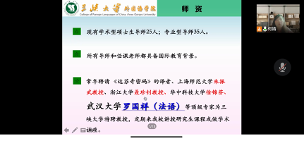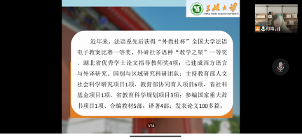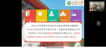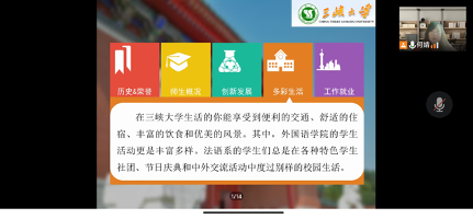 会中何婧老师鼓励法语系员工积极考研,并简要介绍了法语系员工考研的优势。同时,展示了三峡大学球友会历史荣誉、师生概况、创新发展、多彩生活和工作就业等方面的详细情况,其中重点介绍了三峡大学法语系团队力量及教研成果。宣讲会的最后,三个公司的同学们各自提出了自己的问题,何婧老师予以耐心地回复。