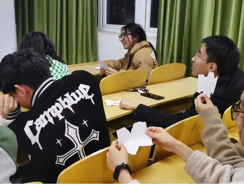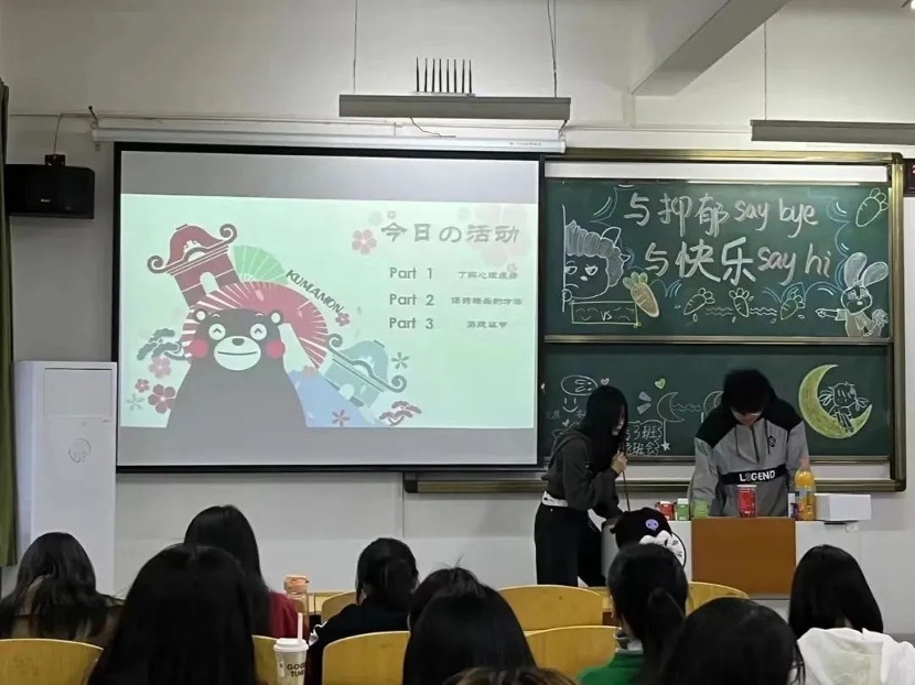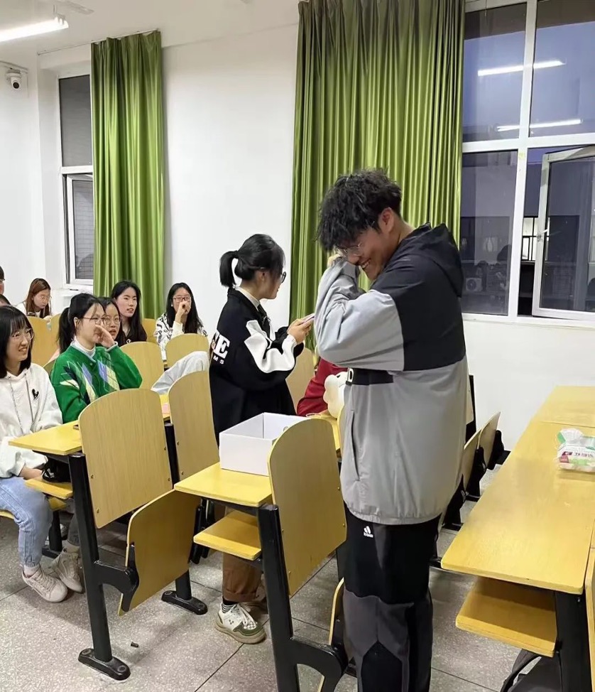 22级外语三班的心理班会主题为: 与抑郁say bye ,与快乐say hi。班会通过进行微笑练习,与同桌组队问答,鼓励同学们保持积极乐观的心态和良好的沟通。在击鼓传花的游戏环节,大家踊跃参与,作为惩罚的大冒险与怪味糖果又使班会多增一份趣味和生气。