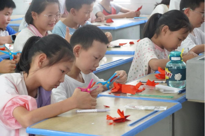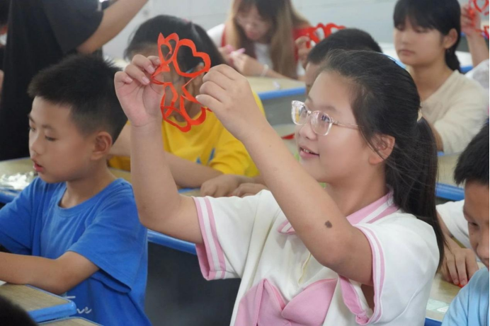 球友会华韵心文化志愿服务队为丰山镇中心小学、丰山镇初级中学共161名员工,精心策划了一场暑假学堂计划。初遇第一天,破冰活动以欢声笑语破除了初见的陌生,而剪纸活动则以创意无限的剪艺,传承了中华千年文化与智慧、编织了师生间深厚的情谊。